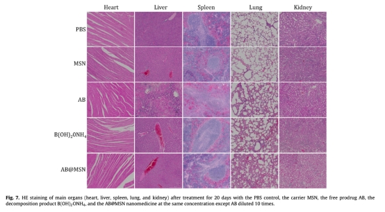 6. 從圖6和7的體內(nèi)實驗數(shù)據(jù)顯示AB@MSN抑制腫瘤生長,小鼠存活率高,器官無損傷,研究意義是驗證AB@MSN在體內(nèi)的有效性和生物安全性,支持其臨床轉(zhuǎn)化潛力。