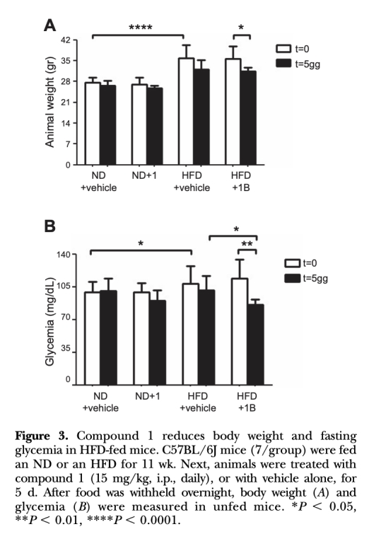 2. 胰島素水平:測量了血漿胰島素濃度。研究意義是評估胰島素敏感性和β細胞功能,化合物1治療降低了HFD小鼠的胰島素水平,表明改善了胰島素抵抗。數據來自圖5。