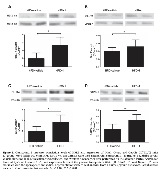 5. 分子標志物:測量了組蛋白H3K9乙酰化、GLUT1、GLUT4和GAPDH的表達水平。研究意義是驗證SIRT6抑制的生物學效應,乙酰化增加證實了SIRT6被抑制,葡萄糖轉運蛋白表達上調解釋了血糖改善機制。數據來自圖8。
