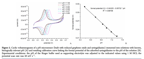 這篇論文的摘要指出,目前缺乏高空間分辨率測量貼壁生長哺乳動物細胞細胞外pH(pHe)的工具,細胞生物學家通常局限于使用商業熒光探針測量細胞內pH。因此,作者開發了一種伏安法pH微傳感器,由修飾了還原氧化石墨烯和syringaldazine的碳纖維微電極組成,用于監測細胞外pH。該傳感器具有良好的靈敏度(60±2.5 mV/pH單位)、重現性(系數變異≤3%)和穩定性(3小時內pH漂移約0.05單位),并成功用于研究癌癥細胞和正常細胞細胞外空間的酸化,揭示了細胞pH調節的細節,這些細節無法用缺乏空間分辨率或無法精確定位的pH傳感器獲得。