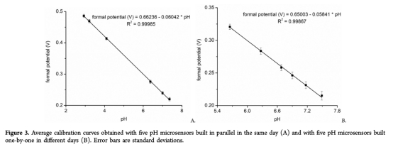 2. pH微傳感器的重現性數據:通過五組傳感器測試,顯示系數變異≤3%,表明傳感器構建一致。這些數據來自圖3,顯示了平均校準曲線。研究意義:確保傳感器可重復使用,減少實驗誤差,提高數據可靠性。