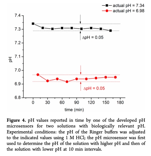 3. pH微傳感器的穩定性數據:在3小時內pH漂移約0.05單位,表明傳感器適合長時間實驗。這些數據來自圖4,顯示了pH隨時間的變化。研究意義:證明傳感器在細胞測量中穩定,能夠捕捉細微pH變化而不受漂移影響。
