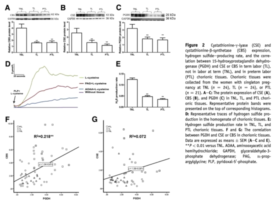 氫硫化物生成酶表達下調在足月和早產分娩中下調絨毛膜15-羥基前列腺素脫氫酶的表達
