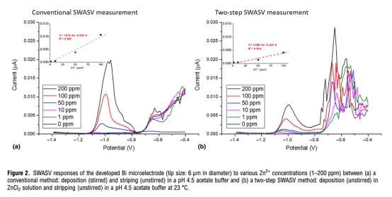 本研究介紹了一種新型的基于兩步方波陽極溶出伏安法的針型微傳感器,用于柑橘植物中Zn2+的原位檢測。研究成功制備了一種雙管鉍/鉑微電極,其堅固的金屬尖端足以刺穿柑橘葉片的厚表皮,并利用SWASV技術靈敏地檢測Zn2+濃度的ppb級變化。該微電極旨在減少傳質限制并改善檢測限。總體而言,所開發的Bi/Pt微電極成功測量了柑橘植物維管束內的Zn2+濃度。