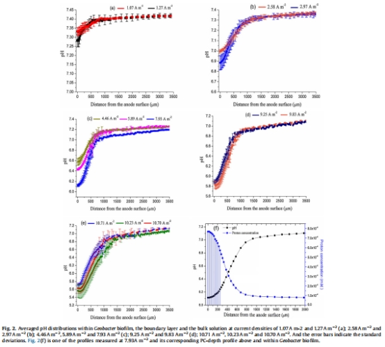 研究意義:圖2顯示pH從體相溶液(~6.90)向陽極表面(最低5.57)顯著降低,形成“S”型曲線。這直接證明了生物膜內(nèi)質(zhì)子積累的存在,且梯度隨電流密度增大而加劇(如10.23 A m?2時梯度達1.33 pH單位)。該數(shù)據(jù)揭示了質(zhì)子傳輸限制是產(chǎn)電性能的關(guān)鍵瓶頸。