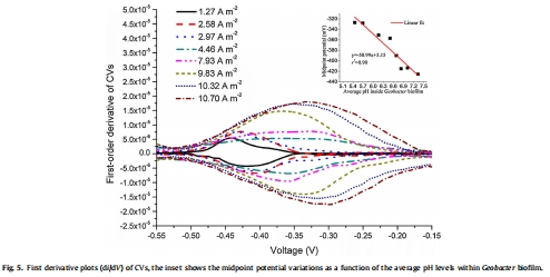測量指標:CV曲線的一階導(dǎo)數(shù)峰值(中點電位)及其隨生物膜平均pH的變化。