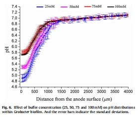 數(shù)據(jù)來源:圖2(a-e子圖,caption: "Averaged pH distributions within Geobacter biofilm...")。
