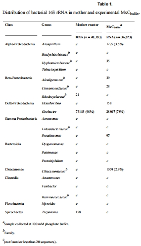 數據來源:表1(caption: "Distribution of bacterial 16S rRNA in mother and experimental MxCbuffer")。