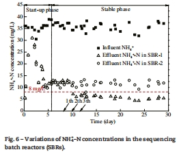 數(shù)據(jù)來源:兩個SBR反應器出水氨氮濃度隨運行時間的變化對比展示在 文檔圖6中。