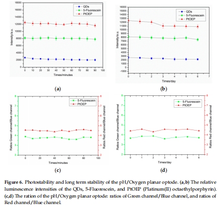 數據內容:連續光照100分鐘后,各染料發光強度下降<10%(QDs:9.82%, 5-Fluorescein:4.70%, PtOEP:6.45%);浸泡一周后強度下降<14%,比率變化<8.5%。