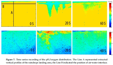 數據內容:模擬降雨40秒內,海水表層(深0-23 mm)氧濃度上升2.3 mg/L,pH降至7.2;垂直和水平剖面顯示降雨對近界面化學梯度的顯著影響。