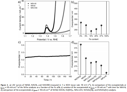性能優勢:最優組分NiFe16在低過電位(240 mV)和長穩定性(160小時)方面優于傳統氧化物/氫氧化物催化劑。