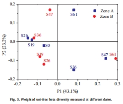 數(shù)據(jù)內(nèi)容:Venn圖顯示A區(qū)樣本共享OTU為227,獨(dú)有OTU最高達(dá)1397(S36A);B區(qū)共享OTU為216,獨(dú)有OTU最高達(dá)1622(S26B)。PCoA分析表明隨運(yùn)行時(shí)間延長(zhǎng),A/B區(qū)樣本間距離顯著增大(圖3)。
