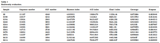 數(shù)據(jù)內(nèi)容:Shannon指數(shù)在A區(qū)從5.65(S19A)升至6.42(S36A)后降至4.87(S61A);B區(qū)從6.09(S19B)升至6.25(S36B)后降至5.19(S61B)。ACE和Chao1指數(shù)顯示類似先增后降趨勢(shì)。