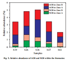 數(shù)據(jù)內(nèi)容:AOB(氨氧化菌)和NOB(亞硝酸鹽氧化菌)在30天時(shí)豐度最高(A區(qū)AOB 1.58%,NOB 0.36%),47天后下降;B區(qū)AOB豐度始終高于A區(qū)。