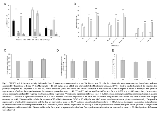 這篇論文研究了范可尼貧血(FA)細胞能量代謝的缺陷,特別是線粒體氧化磷酸化(OXPHOS)功能受損如何導致細胞轉向糖酵解代謝。FA是一種遺傳性疾病,特征包括骨髓衰竭和癌癥易感性,與DNA修復缺陷和氧化應激相關。研究發現,FA細胞中線粒體復合物I到III的電子傳遞受損,降低了OXPHOS效率,但糖酵解通量增加以補償能量不足。同時,谷氨酰胺分解途徑減弱。強制FA細胞使用OXPHOS代謝會增加氧化應激和線粒體膜去極化,表明糖酵解是一種保護性適應機制。這項工作首次系統探討了FA能量代謝, linking這些缺陷 to骨髓衰竭。