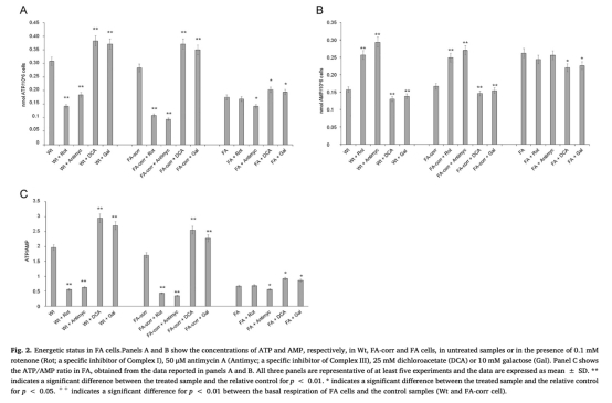 2 ATP和AMP水平:FA細胞顯示ATP濃度降低,AMP積累,ATP/AMP比率下降。數據來自Fig.2。研究意義:反映FA細胞能量狀態失衡,OXPHOS缺陷導致ATP生產不足,觸發AMPK激活以刺激替代能量途徑如糖酵解。