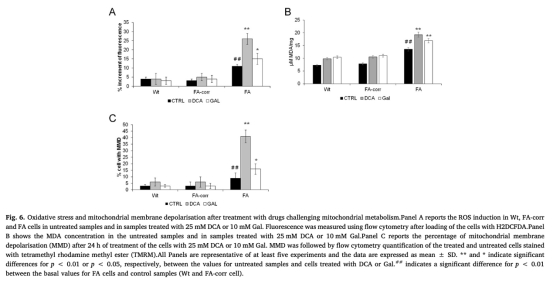 4 氧化應激指標:FA細胞基礎ROS和MDA水平升高,線粒體膜去極化增加。強制使用OXPHOS(如DCA處理)進一步加劇氧化應激。數據來自Fig.6。研究意義:表明OXPHOS缺陷導致氧化應激積累,強制代謝切換會損害細胞健康,這可能與FA中造血干細胞耗竭和骨髓衰竭相關。