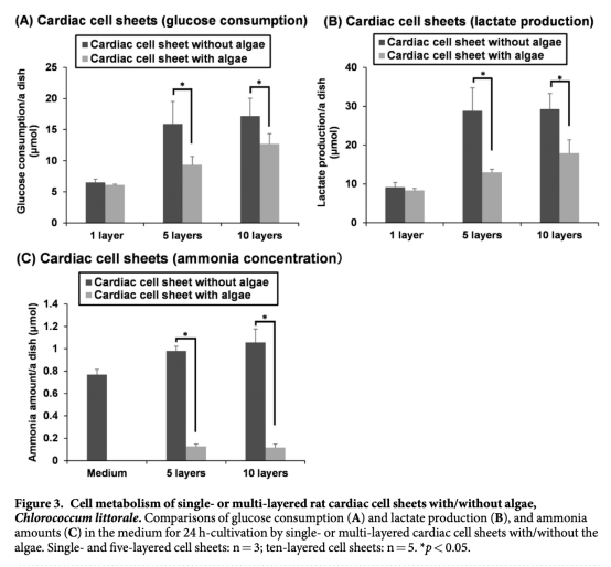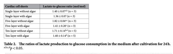 2 代謝物分析:測量葡萄糖消耗、乳酸產生和氨含量。共培養使多層心肌組織的葡萄糖消耗和乳酸產生顯著降低,乳酸/葡萄糖比率從約1.8降至1.4,表明代謝從無氧呼吸轉為有氧呼吸。氨含量減少至單獨培養的1/7-1/8。這些數據來自圖3和表2。研究意義:顯示共生系統改善了組織代謝環境,藻類利用哺乳動物細胞的代謝廢物(如氨),實現了營養回收。