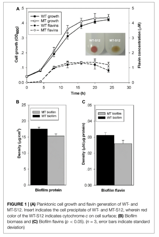 2 生物膜生長(zhǎng)和黃素濃度數(shù)據(jù):WT和MT生物膜厚度相似(約17μm),但MT生物量較低(15 vs 17.5μg/cm2),MT生物膜黃素分泌能力降低12.9%。這些數(shù)據(jù)來(lái)自圖1。研究意義:表明OMC缺失影響生物膜微環(huán)境適應(yīng)性,但結(jié)構(gòu)完整性保留,ENCP可能作為替代電子傳遞路徑。