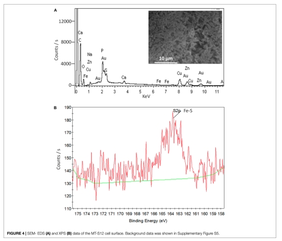 4 元素和化學(xué)鍵分析數(shù)據(jù):EDS檢測(cè)到生物膜中Fe元素(WT 0.11%,MT 0.07%),XPS在163.5eV顯示Fe-S鍵特征峰。這些數(shù)據(jù)來(lái)自圖4。研究意義:證實(shí)ENCP中含F(xiàn)e-S簇等氧化還原中心,可直接參與電子傳遞,支持ENCP在介導(dǎo)EET中的結(jié)構(gòu)基礎(chǔ)。