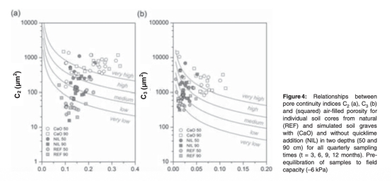 論文摘要指出,墓土中人類遺體的分解可能因土壤通氣不良而延遲,原因是高水位和低滲透性孔隙系統(tǒng)。研究測試了在墓土回填中添加生石灰(CaO)以改善通氣性,生石灰通過脫水和水化作用促進土壤團聚和穩(wěn)定。實驗在德國北部的墓地上進行模擬,比較了添加生石灰和不添加的情況。結(jié)果表明,生石灰處理提高了氣體擴散性和空氣滲透性,表明孔隙系統(tǒng)更連通。土壤呼吸率的變化受采樣時間影響,微生物在堿性條件下仍活躍,但CO2測量受化學反應的干擾。結(jié)論是生石灰應用是改善墓土通氣的有前景的方法。