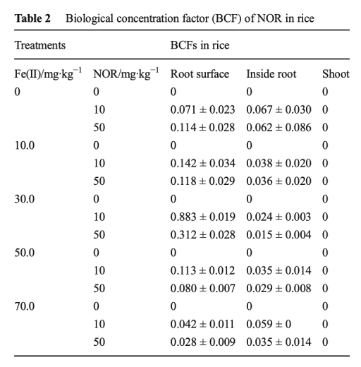 2 諾氟沙星濃度在根表面和內部根數據來自Fig. 2和Table 2(生物濃縮因子),研究意義是評估鐵膜對吸收的屏障作用,顯示高Fe(II)(如30 mg·kg?1)時根表面積累增加而內部減少,證實鐵膜在高諾氟沙星濃度下阻隔吸收。
