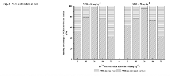 3 諾氟沙星分布百分比數據來自Fig. 3,研究意義是揭示諾氟沙星在根部的分配,顯示鐵膜促進表面積累,減少內部轉運,強調鐵膜對污染物滯留的作用。