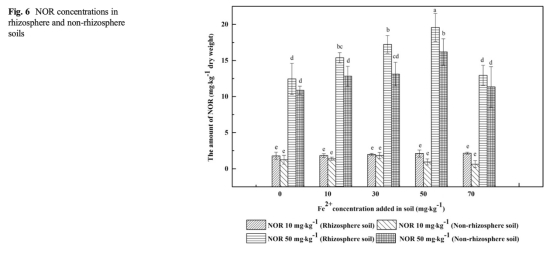 6 諾氟沙星濃度在根際和非根際土壤數據來自Fig. 6,研究意義是比較根際效應,顯示根際積累更多諾氟沙星,因鐵氧化物吸附,突出根際過程對污染物遷移的影響。