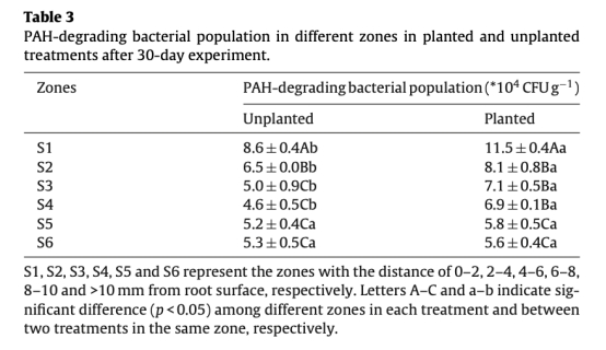 4 PAH降解菌數量:數據來自Table 3,顯示種植處理在S1-S4區(0-8mm)菌數更高(24.6-50.0%),S1區最高。研究意義是揭示微生物活性增強是芘降解的主要途徑,根際效應促進降解菌富集。