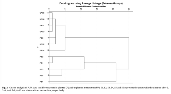 5 微生物群落結構(PLFA):數據來自Table 4和Fig.2,顯示種植處理好氧菌和厭氧菌生物量在S1-S5區(0-10mm)升高,好氧菌主導;聚類分析顯示根際微生物群落改變。研究意義是證實根分泌物和氧氣共同調控微生物群落,好氧菌對降解貢獻更大。