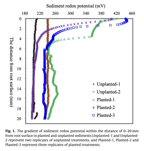 3 沉積物氧化還原電位:數據來自Fig.1,顯示種植處理在根表0-5mm內電位升高,峰值在根表,隨后下降并穩定;未種植處理無顯著變化。研究意義是驗證根際氧化微環境,為氧氣擴散梯度提供直接證據。
