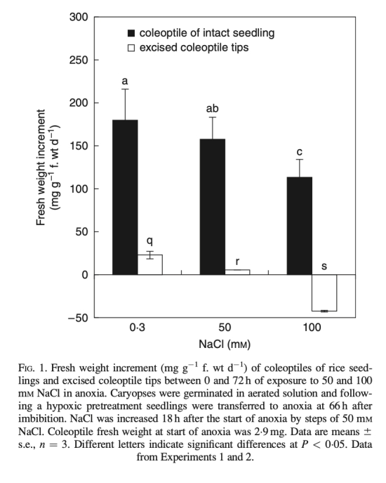 1. 生長數(shù)據(jù):測量胚芽鞘鮮重增量,顯示在缺氧條件下,50 mM NaCl使完整幼苗生長減少15%,100 mM NaCl減少40%;外植胚芽鞘在50 mM NaCl下生長減少75%,100 mM NaCl下致命損傷。數(shù)據(jù)來自FIG.1。研究意義是表明NaCl脅迫加劇缺氧能量危機,生長減少可能為節(jié)能以適應(yīng)脅迫,揭示物種耐受性差異。