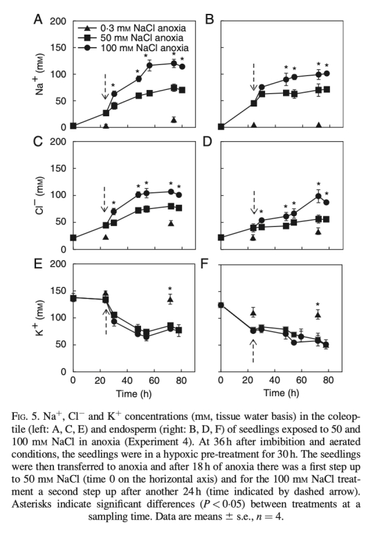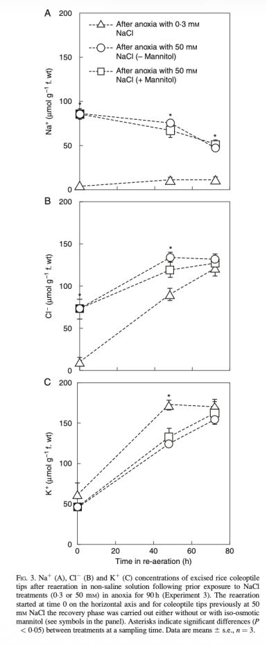 2. 組織離子濃度:測量Na+、K+、Cl-濃度(組織水基),顯示在缺氧條件下,Na+和Cl-濃度隨時間增加,K+濃度下降;外植胚芽鞘在50 mM NaCl下離子通量低于通氣條件。數(shù)據(jù)來自FIG.5、FIG.6和TABLE 3。研究意義是量化離子調(diào)節(jié)效率,表明缺氧條件下離子通量降低以節(jié)能,支持能量經(jīng)濟型運輸?shù)募僭O(shè)。