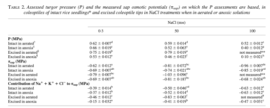 4. 組織滲透勢和膨壓:測量組織滲透勢和計算膨壓,顯示在NaCl脅迫下膨壓下降。數(shù)據(jù)來自TABLE 2。研究意義是反映滲透調(diào)節(jié)成本,膨壓降低可能為節(jié)能適應(yīng),但需維持細胞完整性。