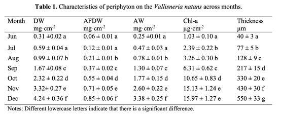 2. 附生生物特性:測量附生生物的干重(DW)、無灰干重(AFDW)、灰重(AW)、葉綠素a含量和厚度,顯示從6月到12月逐漸增加。數(shù)據(jù)來自表1。研究意義是評估附生生物積累與植物生長的關(guān)系,表明附生生物量增加可能影響DBL結(jié)構(gòu)和營養(yǎng)循環(huán)。