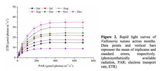 3. 快速光曲線(RLC):測量苦草葉片的光合電子傳輸速率(ETR),顯示光合能力隨生長階段變化,峰值在9月。數(shù)據(jù)來自圖2。研究意義是關(guān)聯(lián)植物光合活性與微環(huán)境變化,證明光合能力驅(qū)動O2和pH梯度。