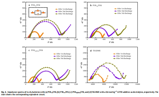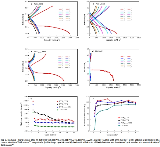 PYR??TFSI和 PYR?(?O?)TFSI的電池表現(xiàn)出更高的首次放電容量和更好的循環(huán)穩(wěn)定性(30次循環(huán));