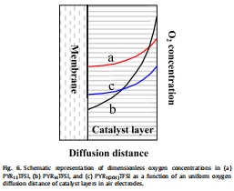 輔助分析傳質(zhì)限制:結(jié)合氧擴(kuò)散系數(shù),可計(jì)算氧在催化劑層的濃度梯度(圖6),解釋為何高溶解度但低擴(kuò)散系數(shù)的電解質(zhì)(如PYR??TFSI)仍可能導(dǎo)致早期電極孔道堵塞。