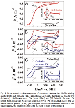 論文摘要指出,本研究通過電化學(xué)表征(循環(huán)伏安法CV和差分脈沖伏安法DPV)探討了電活性生物膜中雙向電子轉(zhuǎn)移的機制。實驗首先在陽極條件下(乙酸氧化,電極電位+397 mV vs. SHE)培養(yǎng)成熟生物膜,然后切換至陰極條件(硝酸鹽還原,電極電位-303 mV vs. SHE)。結(jié)果表明,乙酸氧化和硝酸鹽還原發(fā)生在相似的形式電位(約-175 mV vs. SHE),生物膜主要由Geobacter sp.組成,暗示可能使用相同的電子傳導(dǎo)通路進行雙向電子轉(zhuǎn)移。