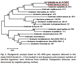 數(shù)據(jù):DGGE譜圖顯示Geobacter sp.為優(yōu)勢菌(帶寬相對強度在陽極條件下為16.8%,陰極條件下為27.4%);其他菌如Rhodocyclaceae在陽極條件豐富(16.7%),但陰極條件下消失,而Synergistetes在陰極條件增加至26.0%。系統(tǒng)發(fā)育樹(圖5)確認(rèn)Geobacter sp.與已知菌株相似度>99%。