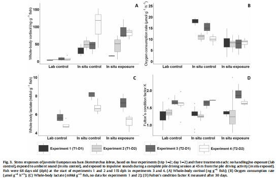 論文摘要指出,離岸風(fēng)力發(fā)電場建設(shè)中的打樁活動產(chǎn)生的水下脈沖聲音是主要環(huán)境關(guān)切點。本研究通過四個原位實驗(距離打樁活動45米),評估了幼年歐洲海鱸魚(68日和115日齡)的聲學(xué)應(yīng)激反應(yīng)。研究發(fā)現(xiàn),初級應(yīng)激反應(yīng)指標(如全身皮質(zhì)醇)因易受“處理操作”干擾而敏感性不足;而次級應(yīng)激反應(yīng)(如耗氧率和全身乳酸濃度)對打樁聲音響應(yīng)顯著——耗氧率降低,乳酸濃度偏低。重復(fù)暴露于脈沖聲音會加劇初級和次級應(yīng)激反應(yīng)。在實驗室條件下,處理30天后未觀察到三級應(yīng)激反應(yīng)(如特定生長率或Fulton條件因子變化)。然而,急性應(yīng)激反應(yīng)和野外潛在重復(fù)暴露必然導(dǎo)致野生魚類適應(yīng)性下降。