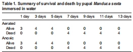 數(shù)據(jù):Table 1顯示蛹在5天浸水內(nèi)全部存活(通氣組與缺氧組無差異),7天后全部死亡;幼蟲最長存活4小時(shí)。