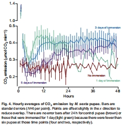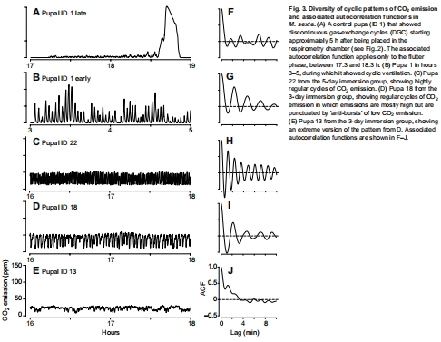 數(shù)據(jù):Fig. 2展示24個(gè)蛹的CO?軌跡,顯示恢復(fù)期三階段:初始高峰(5-10分鐘)→ 低谷 → 周期性排放(振幅與頻率隨浸水時(shí)間延長而增加)。Fig. 4每小時(shí)平均代謝率表明,浸水蛹的CO?排放率在恢復(fù)期持續(xù)升高(1天組峰值在10-12小時(shí),3/5天組持續(xù)48小時(shí))。