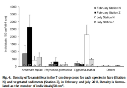 數(shù)據(jù):Fig.4顯示有孔蟲總密度在2月有植被站點(diǎn)最高(如站點(diǎn)Z達(dá)4350個(gè)體/50 cm2),7月無植被站點(diǎn)E. scabra占主導(dǎo)(78-91%)。物種以A. tepida、H. germanica和E. scabra為主。