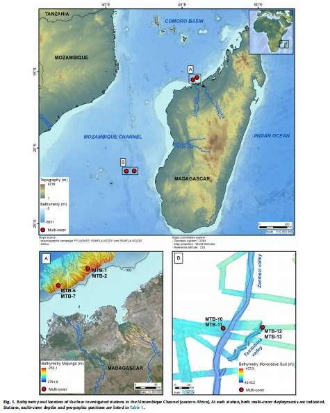 站點選擇:在莫桑比克海峽選取四個對比站點(Fig. 1),包括兩個上坡站點(Betsiboka和Mahavavy斜坡,530-780米深度)和兩個深海峽谷站點(Tsiribihina和Zambezi峽谷,>3000米深度),覆蓋不同營養(yǎng)水平和氧合條件。