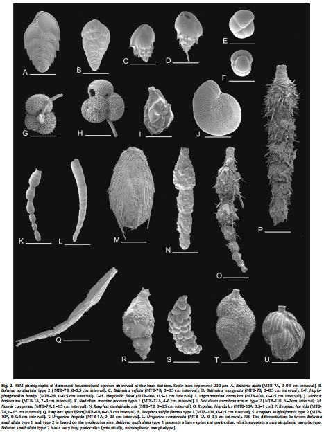 數(shù)據(jù):Fig. 2展示主要物種SEM照片(如Bolivina alata、Bulimina marginata);Fig. 7通過堆疊圖顯示物種垂直分布,如上坡站點Bolivina alata在0.5-2.0 cm豐度最高,峽谷站點Hospitella fulva占據(jù)深部微生境。