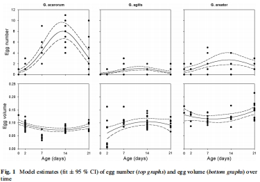 數據:Table 1 顯示平均卵數:G. acarorum 最高(3.64 ± 0.38),G. agilis 最低(0.54 ± 0.07);Fig. 1 通過模型估計展示卵數和卵體積隨時間變化,如 G. acarorum 卵數在 14 天達峰。