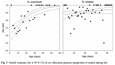 數據:Table 1 中實際后代數:G. areator 最高(83.30 ± 13.39),G. agilis 最低(19.56 ± 2.39);Fig. 2 顯示繁殖力隨年齡變化,G. areator 持續高產;Fig. 3 表明有性物種雄性比例高(G. acarorum 雄性占 82%,G. areator 占 88%)。