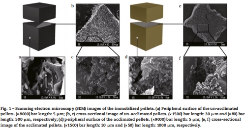 數(shù)據(jù):Fig. 1 的SEM圖像顯示,未馴化顆粒表面孔隙多但細菌稀疏(圖1a-c),而馴化后顆粒表面覆蓋密集桿狀菌生物膜(厚度80-120 μm),截面顯示細菌主要分布于外層(0-300 μm)(圖1d-f)。